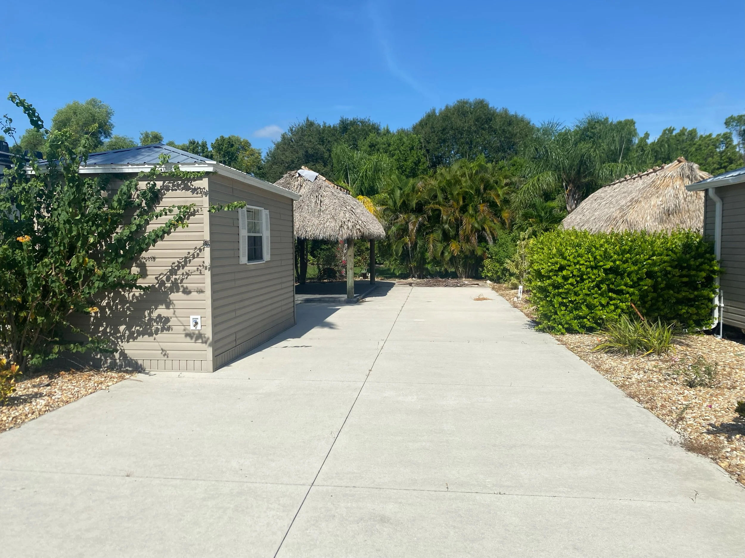 Lot 284 offers a west facing back in Concrete lot and has a blank canvas awaiting your special touch. Do you want a tiki hut or a gazebo and Amazon shed? You can update the inside of the shed and have a shower, toilet, sink and Mini-split or just use it for storage. Do you prefer an outdoor kitchen or how about some special Colusa, Sylvester Palms, or additional vegetation? Do you want whole lot irrigated or partial irrigation? Finish your side and rear patio with pavers for a private paved area. This lot is right around the corner from the clubhouse, the pool, the gym, Pickleball courts, shuffleboard courts, tennis court or bocce ball. On Tuesday you can let the bags fly playing a round Robin of Cornhole competition.