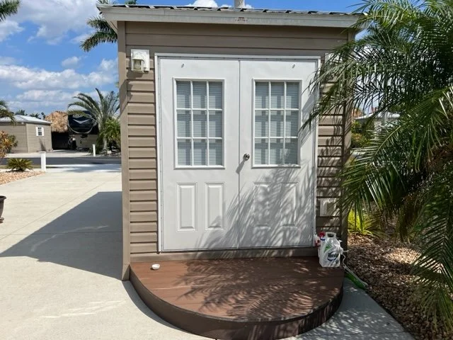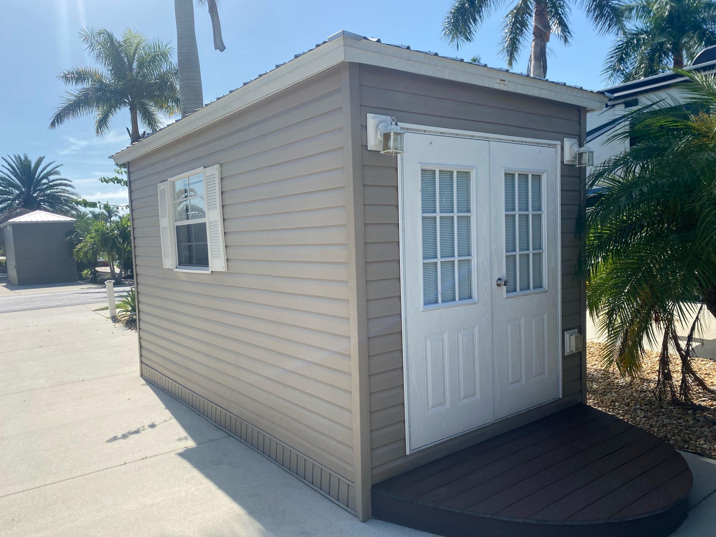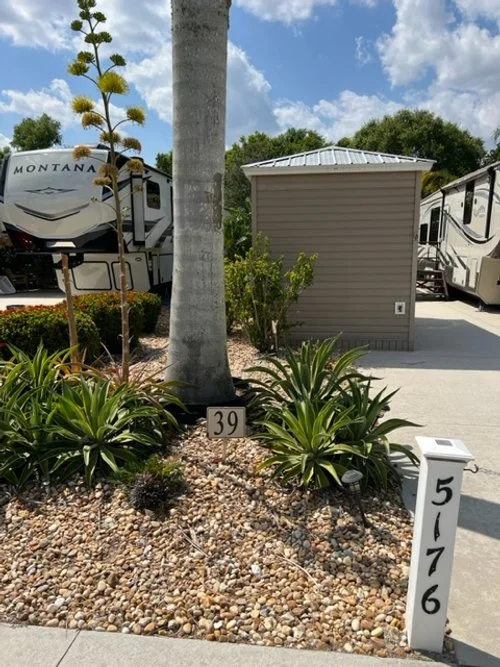 Lot 100 offers you a complete paved lot with very nice neutral colors that is facing west and in this area of the park it has some of the most available privacy. It is just steps away from the doggy park and the recycling center on Cypress Trail resort Circle. There are no RV lots behind you only a nice fence to separate you from the storage area. Included on the lot is an Amazon 8 x 14‘ finished shed that includes a extended 8 x 15‘ roof to create a porch that offers you additional sun / weather protection. The extended roof includes a fan and is maintenance free. A large paved two step entrance going into your shed has been added for additional safety when you step inside your professionally finished shed. The shed is complete with drywall and insulated LED lighting Soft blue paint. Also included in the shed is a one piece fiberglass shower, toilet, sink/vanity with drawers and a large floor to ceiling wall cabinet for additional storage. There is an on-demand hot water heater and a mini split that will keep you comfortable along with your ceiling fan year round. Small stones trim out your side and backyards and there is some nice landscaping on this property.