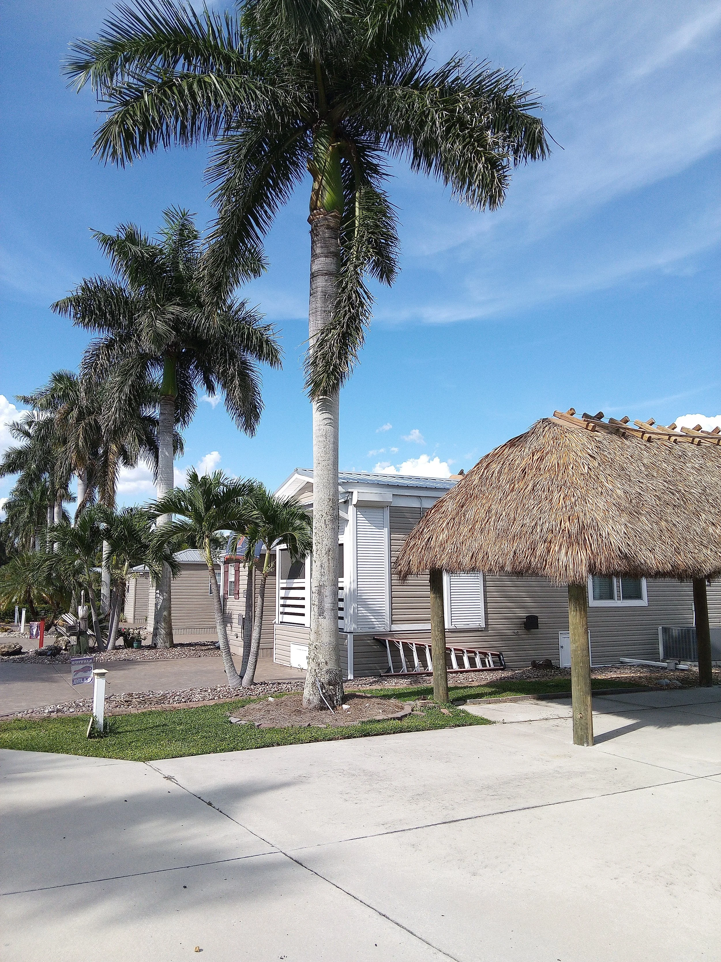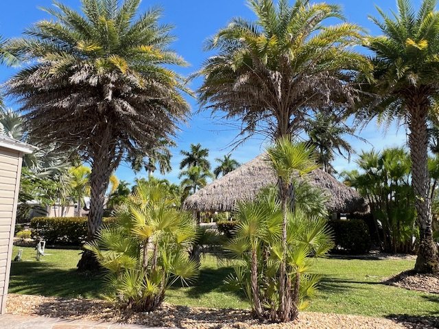 Lot 322 offers just what you need to relax on Cypress Trail Sunrise Lake. It is an all paved south facing lot perfect for driving straight in with your motorhome. The lot features several mature Sylvester palm trees and a spectacular view of the water fountain. Included on the lot is a finished 12 x 24‘ Tiki Hut with two upgraded bonus additions that you won’t find on any normal lot. It has special surrounding curtains hung on a metal railing with snaps to hold it in place that retails for over $10,000 and is wonderful for the cooler months. It is thatched with an artificial thatch that has approximately 14 years left on a 20 year warranty. Included in the Tiki Hut is a 50 inch digital LG television and twin ceiling fans. Also on the lot is a 10 x 12‘ Amazon shed which offers additional storage and includes a toilet, sink, an extra super size shower module, a ceiling fan and the water is heated by an on-demand hot water heater. The Amazon shed is insulated, drywalled and also cooled and heated by a mini split, plank flooring, ample storage cabinets throughout with some overhead storage. Come experience luxury RV living on this lake lot has.