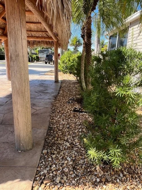 Lot 265 is a Back in stamped concrete lot with your RV facing Sunset Lake. Enjoy the shade from your Big Kahuna10 x 20 tiki hut which will protect your furniture from the morning dew.